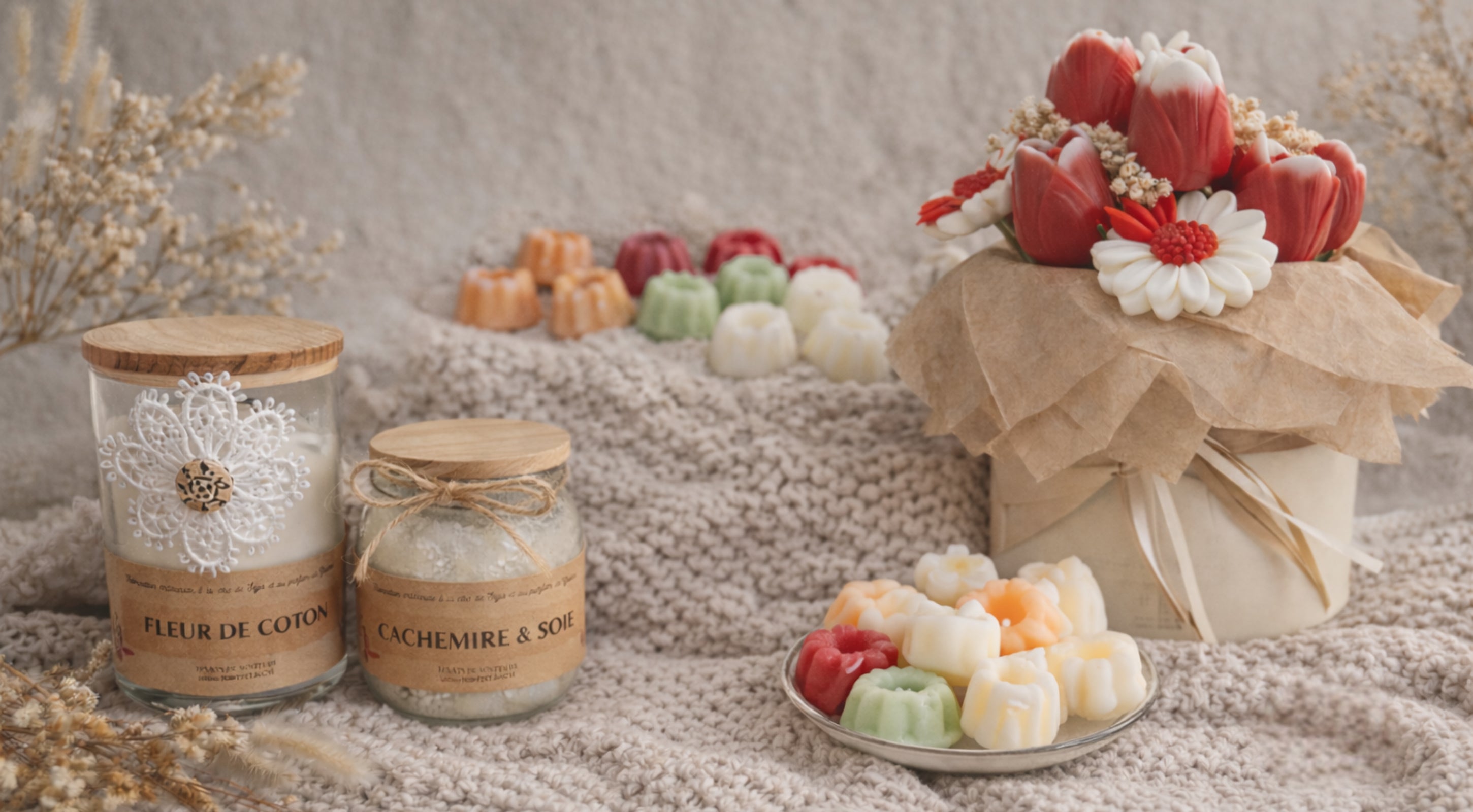 Façonnées à la main en Alsace, nos créations uniques parfumées (bougies, fondants, bouquets de fleurs en cire, etc) associent cire végétale et parfums de Grasse pour une senteur raffinée qui dure. L’attention parfaite à offrir, pour marquer les esprits, créer des souvenirs qui restent et sublimer chaque intérieur.